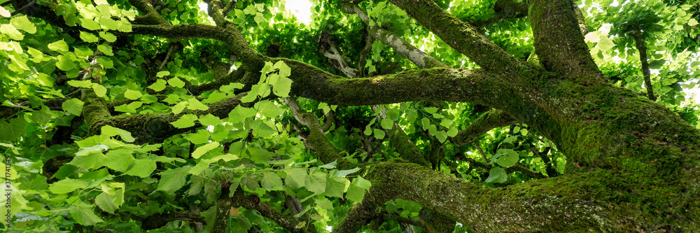 Panoramic view into the tree top of the linden tree. Green natural background