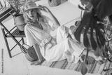 Young elegant fashionable model wearing summer white crochet jumpsuit, straw hat, heeled sandals, with wicker bag, sitting on floor, posing at home, in stylish boho interior with trendy decorations