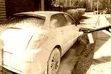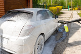 Manual unknown car wash with high pressure water equipment pump at home backyard outdoors on bright shiny summer day. Vehicle covered with foam shampoo chemical detergents during carwash self service