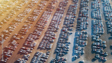 Aerial view new car lined up in the port for import and export business logistic to dealership for sale. Huge storage parking with new cars. Commercial business industry.