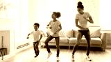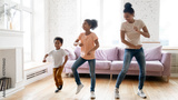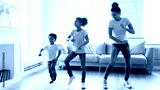 Active leisure together with kids. Millennial african mother teaching school age daugter and little son modern dance movements, black boy and girl spend time at dancing with young babysitter at home