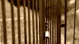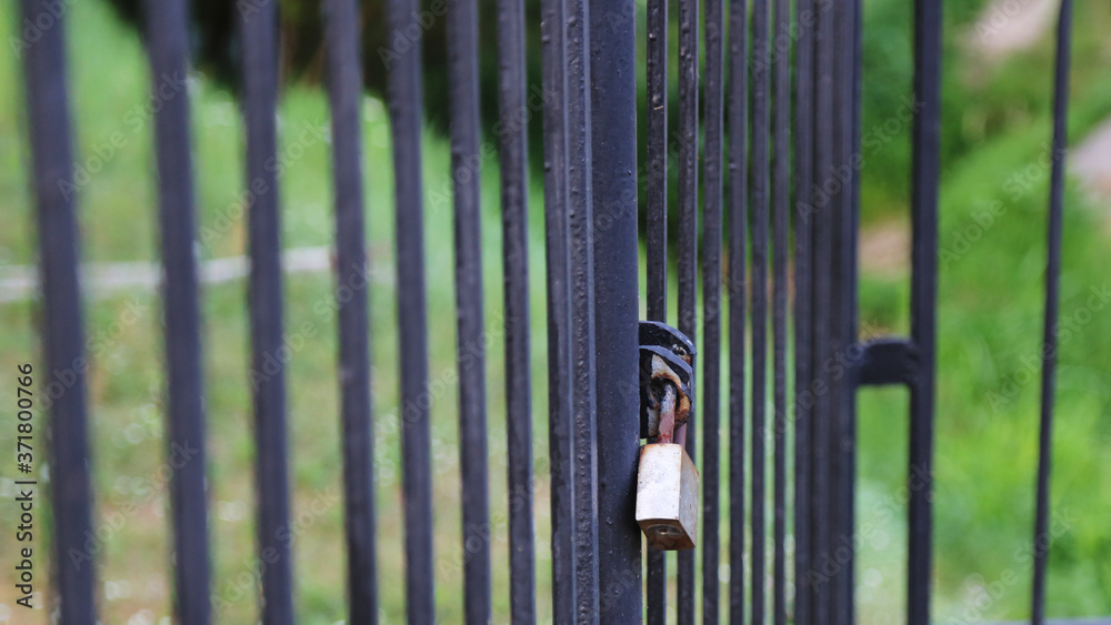 A padlock hangs on a metal fence. A rusty lock hangs on a black fence. Background. Hedge on the background of nature.
