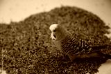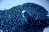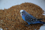 A budgie stands sideways on the grain,up close. The blue parrot is turned to the side against a background of various seeds. Near. The beak, eyes, feathers. A pet, a small bird.