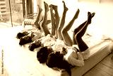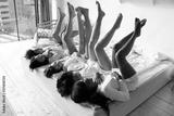 Five multi-ethnic ladies wearing white morning robes lying in bed laughing raised slim silky skinned legs up, hang out together after spa procedures skin care, enjoy bridal shower, having fun concept
