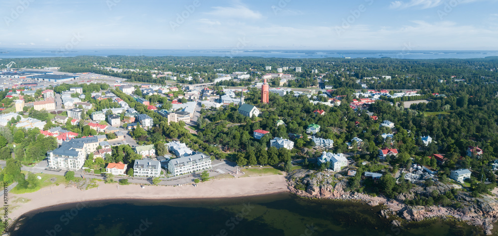 Aerial panorama of the coast of Hanko from the East Bay. Sunny summer morning. Finland.
