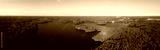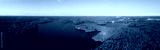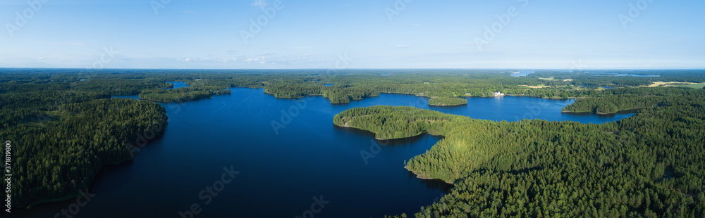 Aerial view of beautiful lake with islands and green forests in Finland on a sunny summer day. Drone photography