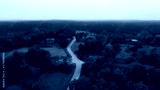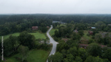 Aerial Drone Shot of Cloudy Misty Foggy village in Finland. Traditional red cabins. Beautiful landscape with village in fog.