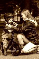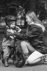Family in a rainy park. Kids in a puddle. Child having fun outdoors. Boy in a bicycle.