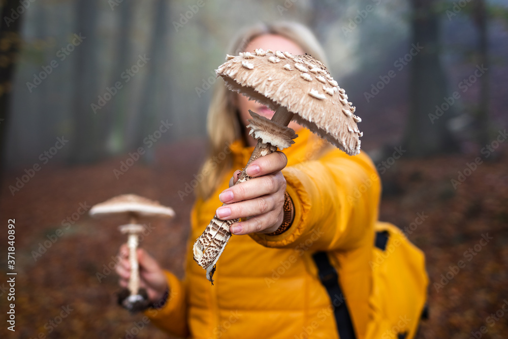 Hiking woman is showing parasol mushroom found in forest. Exploration autumn woodland. Edible mushroom (Macrolepiota procera) in female hand