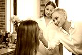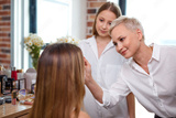 professional make-up teacher, visagiste with her student girl applying makeup on the eyes at master class in beauty school