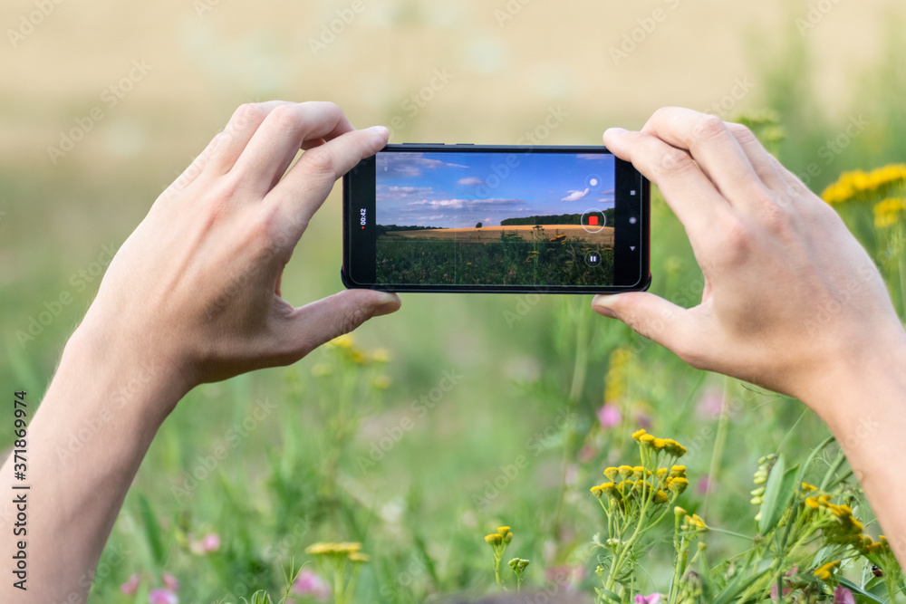 Holding smart phone with two hands horizontally and taking photos of summer wheat field summer sunny nature landscape