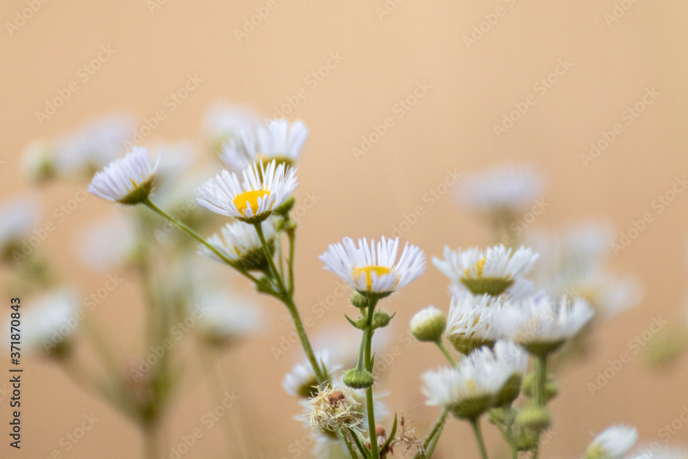 Sweet tiny white daisy like flowers macro in wild nature on beige yellow color blurred background environment. Erigeron prairie fleabane close-up