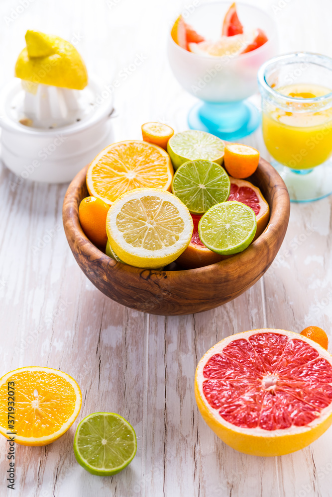 Assortment of citrus fruits on wooden background. Preparing lemonade, ice tea or summer drink.