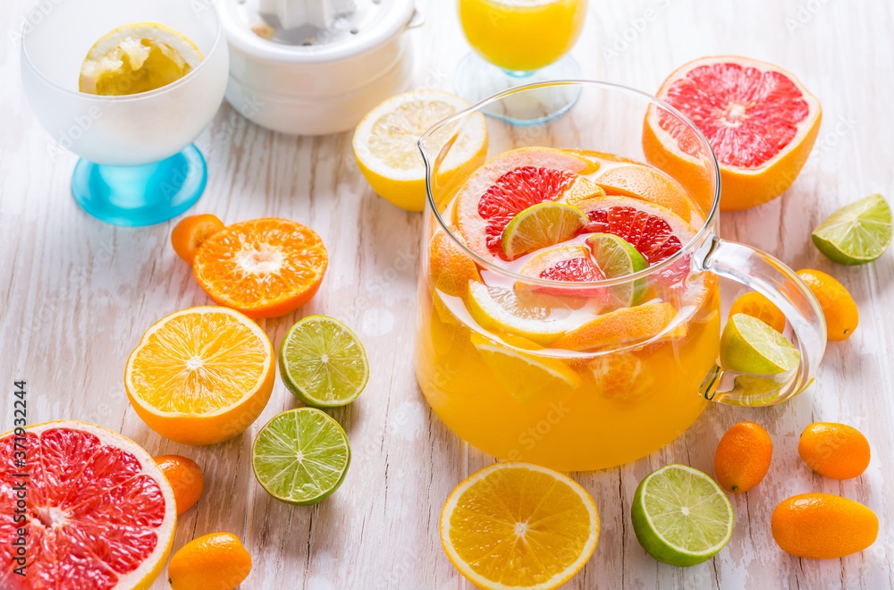 Freshly prepared ice tea or lemonade with assorted citrus fruits.