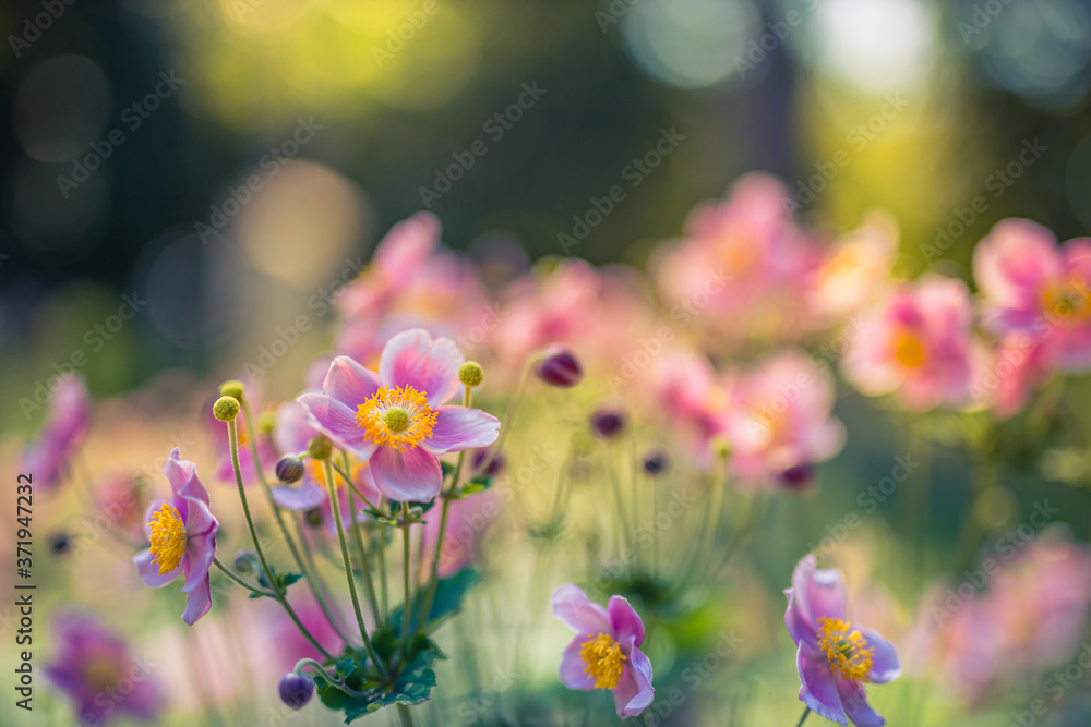 Beautiful pink flower anemones fresh spring on blurred sunrise nature landscape on soft sunset background, macro. Spring summer template, uplifting amazing artistic nature flowers closeup