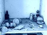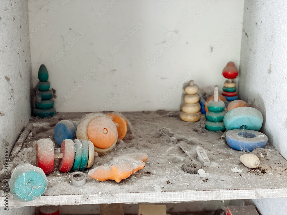Children's toys covered with dust and debris in the ruins of an abandoned house. Abandoned and destroyed houses after the accident at the Chernobyl nuclear power plant.