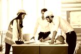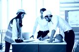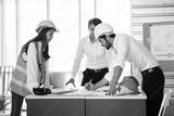 Smart Engineer and interior designer working renovation construction progress with smile and confident at desk with model home ,blue print and drawing tool at office site.