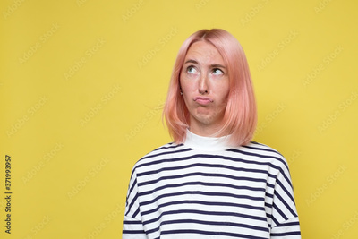 Annoyed young skeptical woman looking up isolated on yellow wall