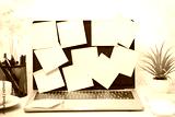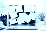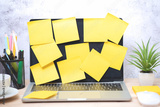 Yellow post-it on the laptop. memo paper on a screen laptop computer. scheduled for job or short note for work concept.