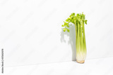 Fresh raw celery standing along the wall casting a shadow, minimalist healthy nutrition concept