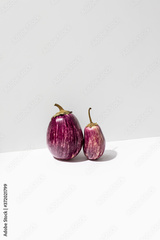 Aubergine casting strong shadow on a white surface, minimalist nutrition concept, front view of healthy food ingredient