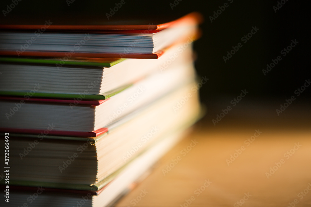 Close-up of a stack of books. The concept of home reading of paper books, school education and Institute, back to school. Space for text, background.