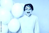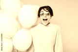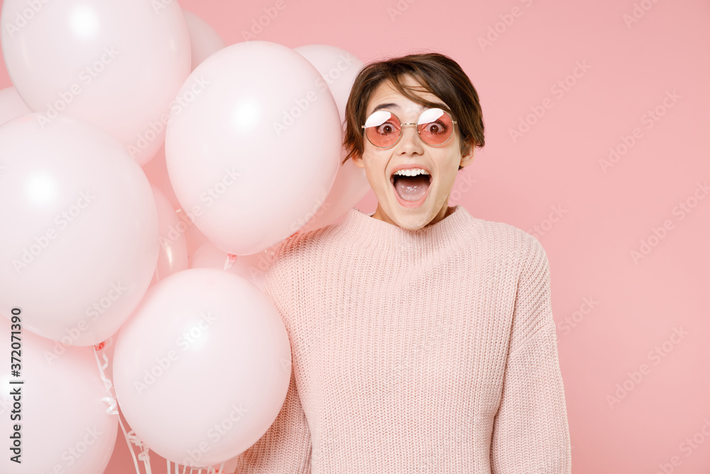 Excited young brunette woman girl in knitted casual sweater glasses isolated on pastel pink background studio portrait. Birthday holiday party people emotions concept. Celebrating hold air balloons.