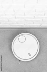Home Cleaning Concept. Modern robot vacuum cleaner cleans houses on porcelain tiles against a brick wall. New technologies, quick house cleaning automatic robot assistant. Smart appliance for cleaning