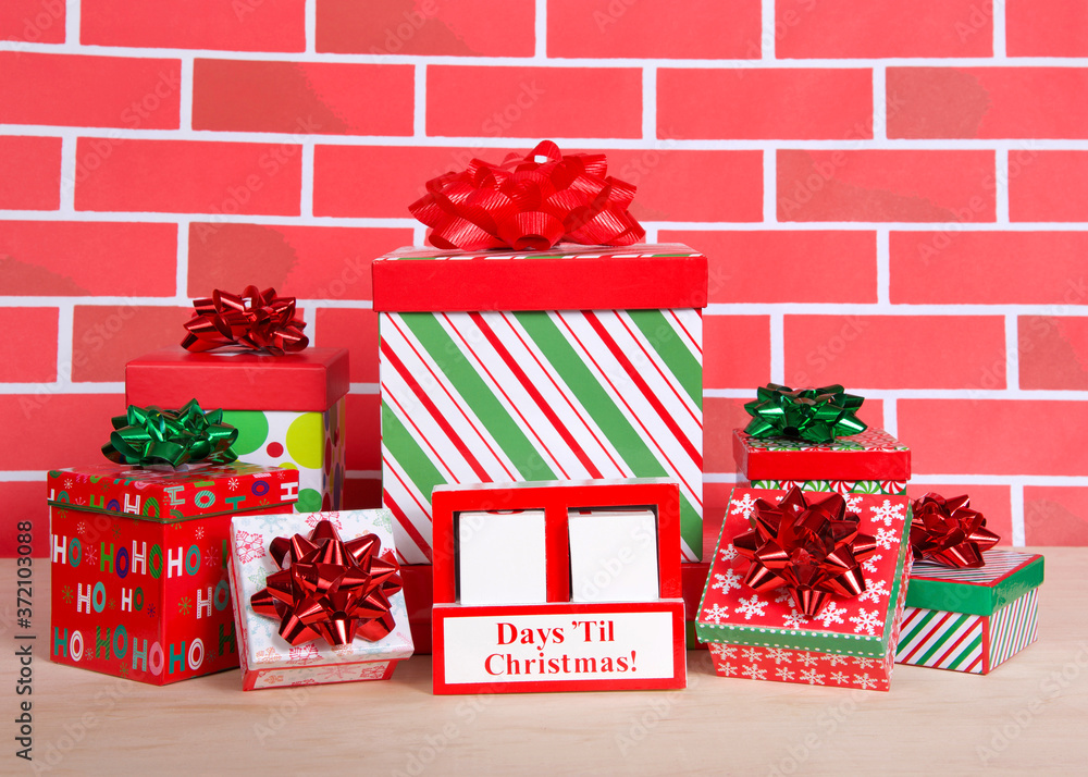 How many days til Christmas white wood blocks in a red box with presents stacked around it sitting on a light wood table with cartoonish brick wall background. Count down blocks blank to fill in days.