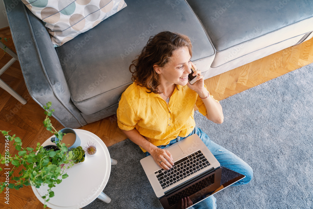 Beautiful young girl woman in yellow shirt works on laptop at home in living room sitting on floor, top view