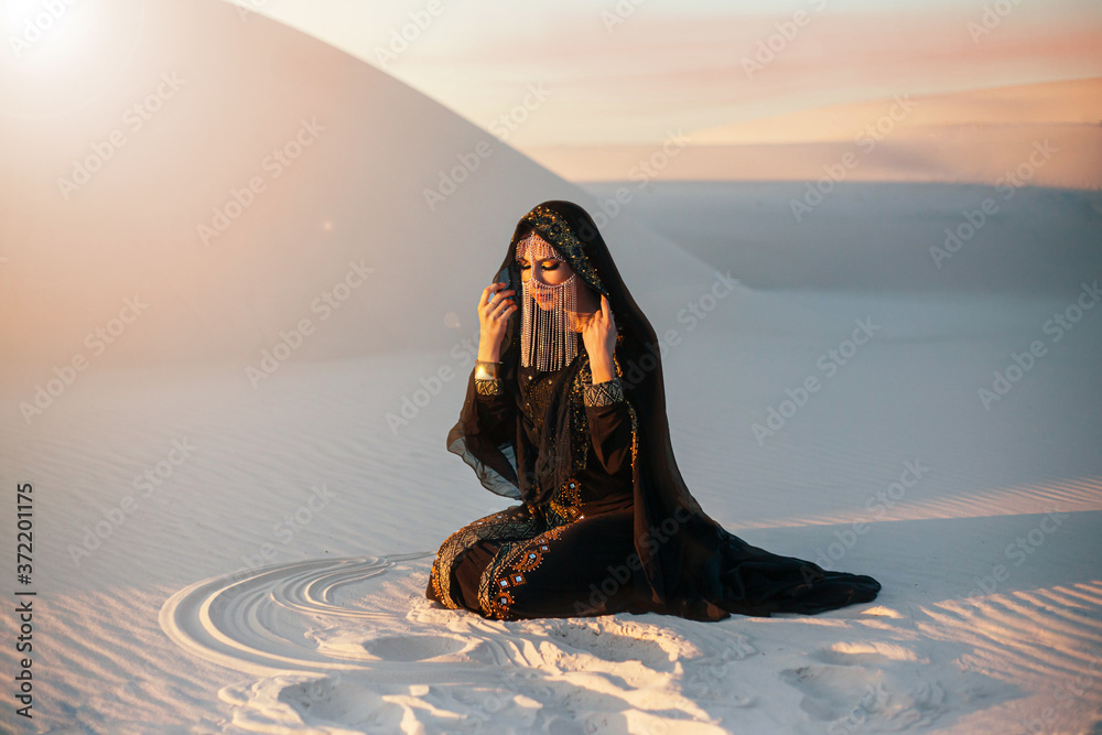 A mysterious woman in a black long dress sits in the desert. Luxurious clothes, gold accessories hide the face. Oriental beauty fashion model. Sand dunes background, orange sunset . Art Fantasy photo
