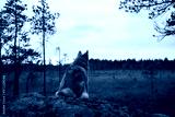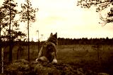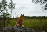 A dog in the forest is sitting on a rock and looking at nature. Travel and hike with a pet. Beautiful atmospheric photo of an animal.