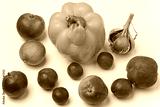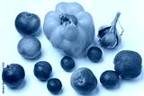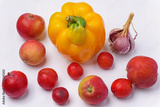 Top view of yellow pepper fruit and other vegetables on a white background close up
