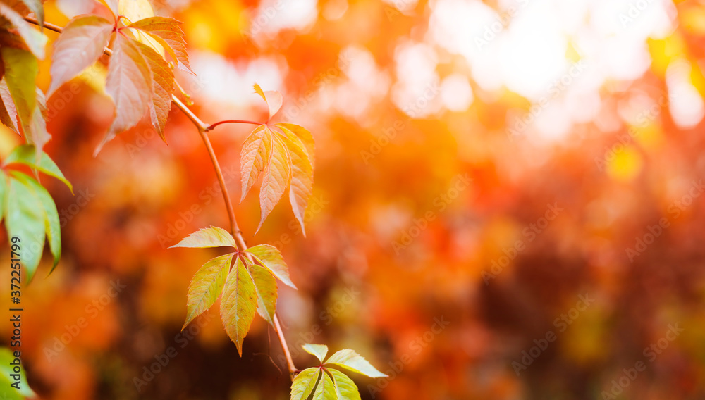 Autumn background design with colorful red and yellow leaves of bindweed plant with blurred free space