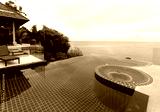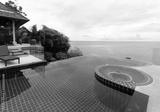 Swimming pool overlooking view andaman sea and clear sky background,summer holiday background concept.