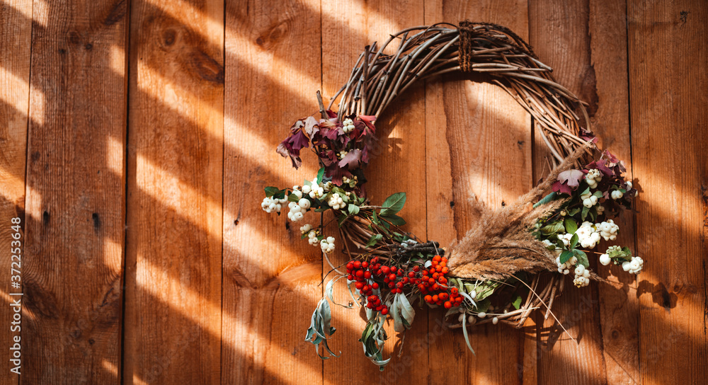 Decorative design window on the terrace. autumn wreath and pumpkins vintage old chest drawers wooden rustic background