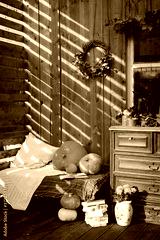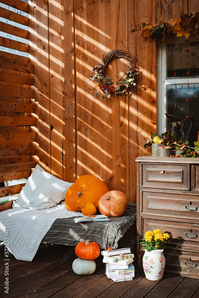 Decorative design window on the terrace. autumn wreath and pumpkins vintage old chest drawers wooden rustic background