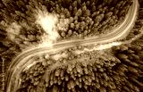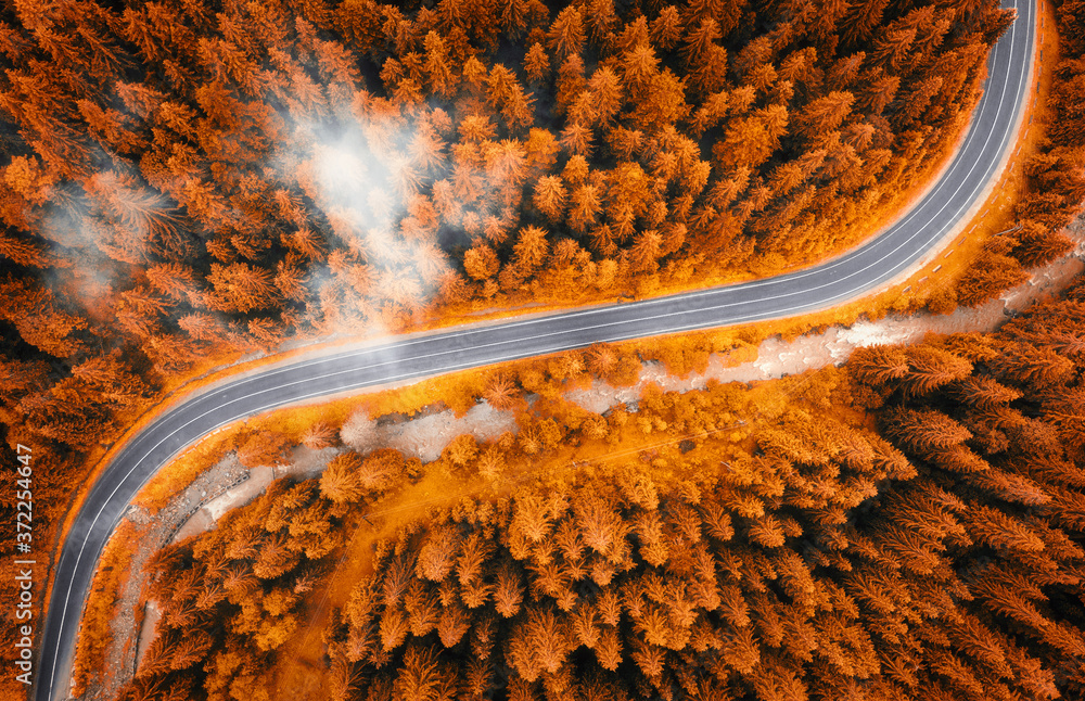 Aerial view of road in beautiful orange forest in low clouds at sunset in autumn. Colorful landscape with roadway, pine trees in fog in Carpathian mountains in fall. Top view of winding road. Travel