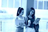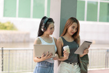 Young Asian college students studying on campus outdoor with laptop and using digital tablet, education concept