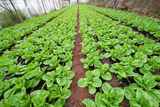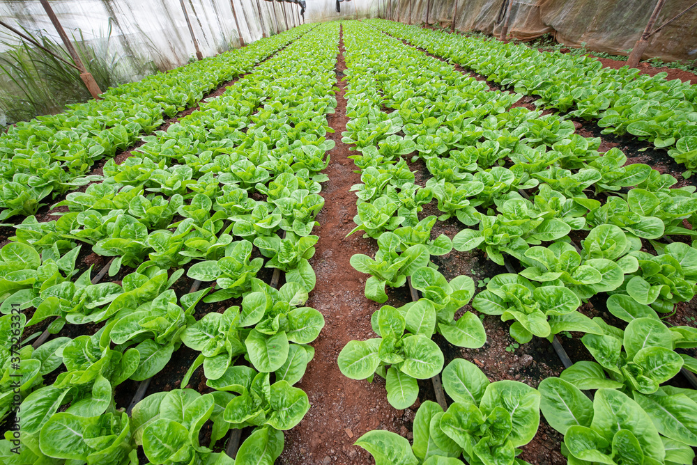Fresh green romaine or cos lettuce in greenhouse cultivation