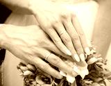 hands of the bride and groom with gold wedding rings on the background of a bouquet, wedding