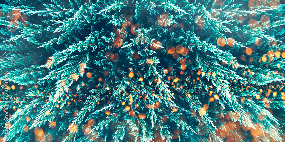 Winter holiday, Chr and new year trendy design background with bokeh light. Moody green conifer tree texture from above. Green botanical minimal creative art pattern. Forest pine tree festive banner.