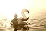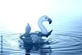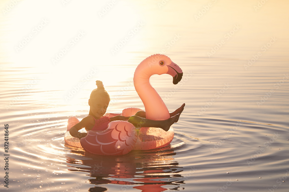 Cute little child girl in a pink swimsuit resting on inflatable pink flamingo in the ocean water. Summer vacation concept