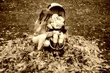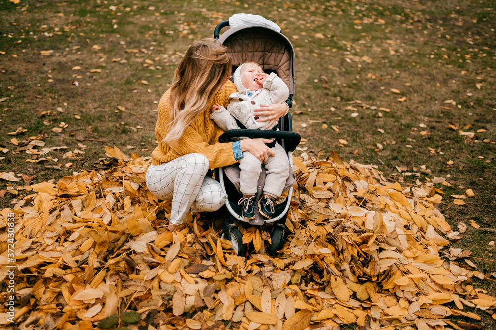 A beautiful little baby in a stroller outside in the fall with its lovely happy mum in leaves