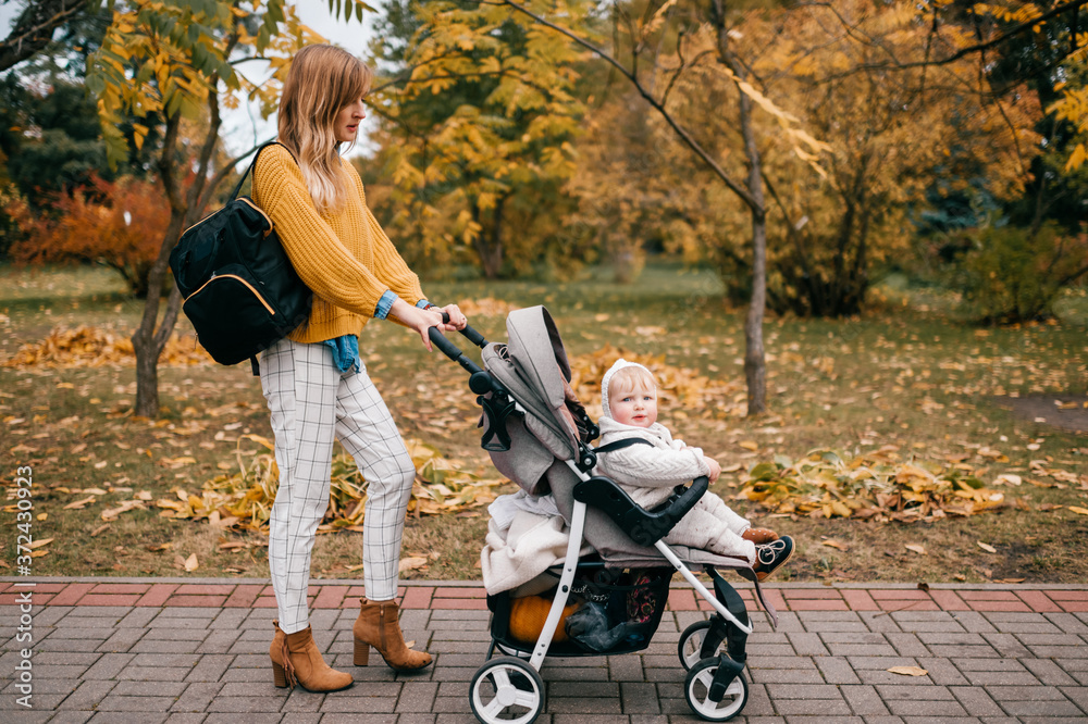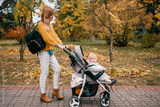 A beautiful little baby in a stroller outside in the fall with its lovely happy mum
