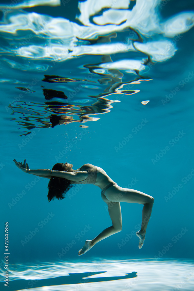 A woman with nice body dancing under water.Underwater photo