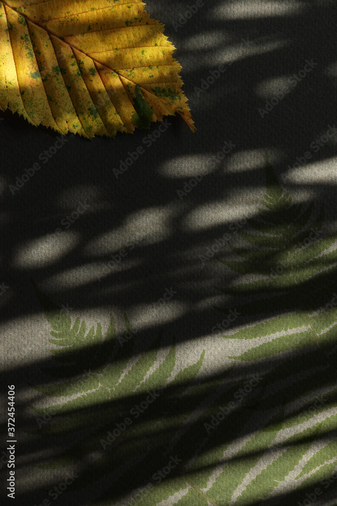 Yellow beech leaf and green fern on textured dark grey background. Autumn mood background with place for custom text.