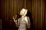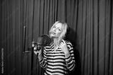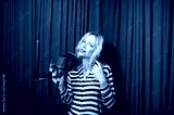 beautiful girl singing in a recording studio
