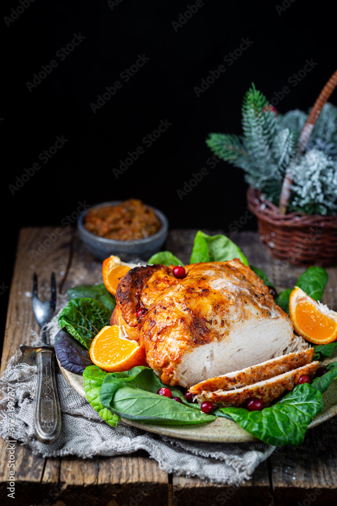 Delicious sliced turkey breast for Thanksgiving Day table on wooden board