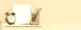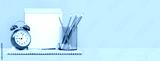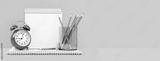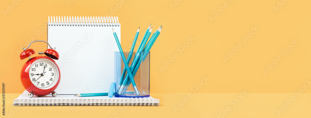 Sketchbook and note pad with office supplies and school blue stationery on orange and red alarm clock on desk. back to school or education and craft concept. Selective focus. Copy space. Banner